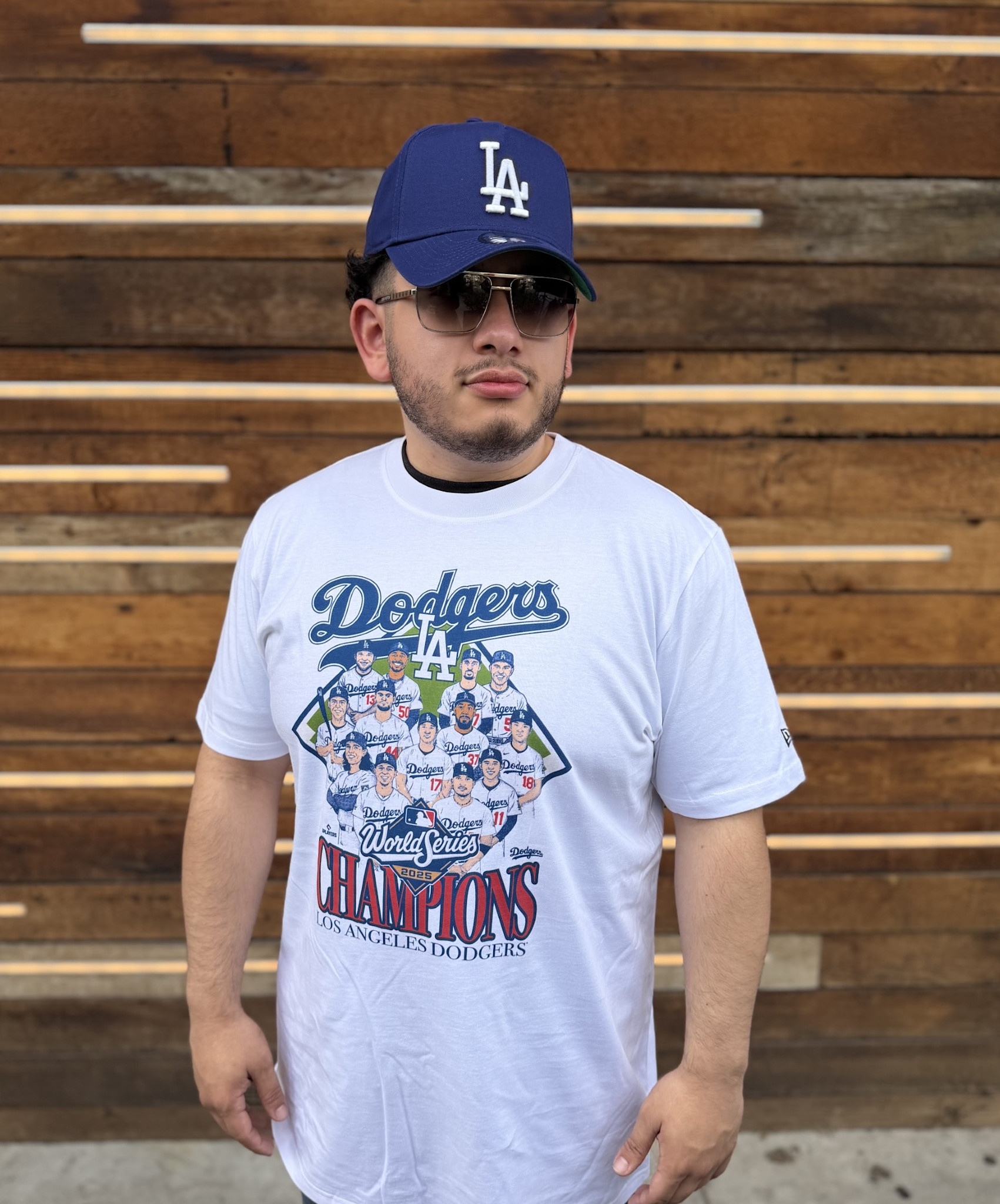 LA Dodgers NE Men's Champs Team Caricature White Tee